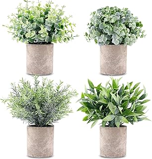 CEWOR 人工ミニ鉢植え植物 フェイクグレー 緑 ユーカリ ローズマリー ボックスウッド プラスチック センターピース バスルーム シェルフ ホーム オフィス デスク テーブル 屋内装飾 4個パック