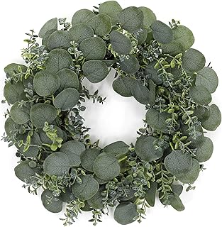Jolitac 18インチ 人工リース グリーンリーフ ラタンベース織り ハンドメイドユーカリ コットンフラワー ひまわり ローズ フラワーリース ホームウォールドア装飾用 (ユーカリ-18インチ)