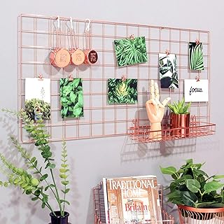 Simmer Stone ローズゴールド壁グリッドパネル 写真吊り下げディスプレイ & 壁装飾オーガナイザー 多機能壁ストレージディスプレイグリッド クリップ5個&釘4個付き 1セット サイズ17.7インチ x 37.4インチ